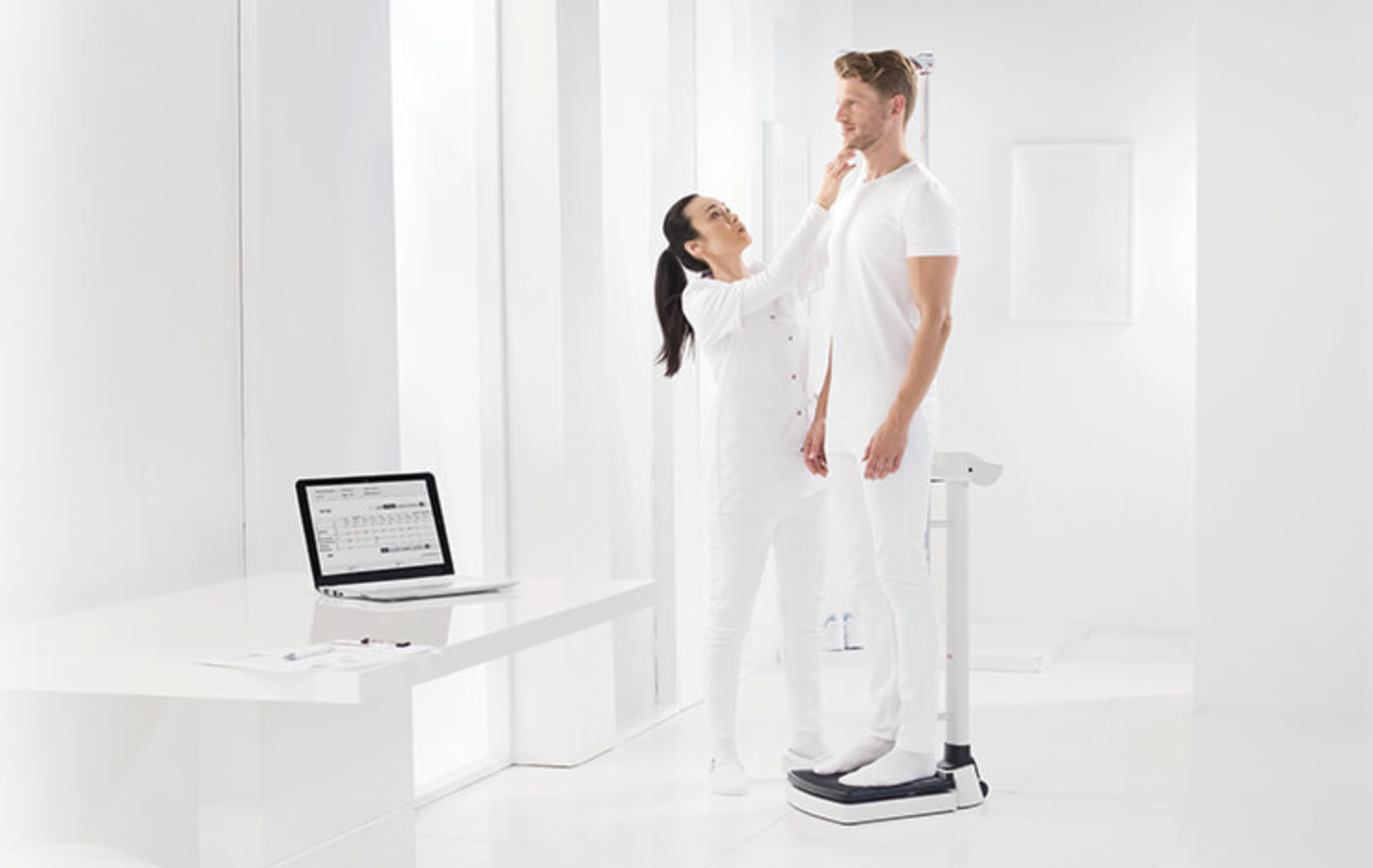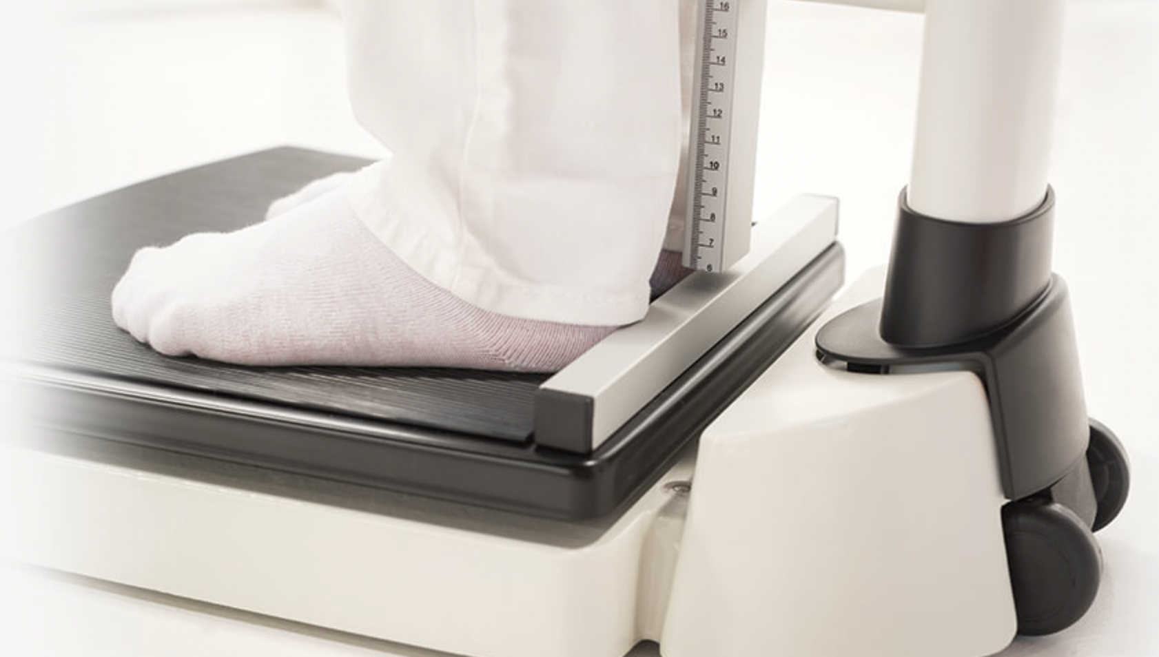- The height measuring rod with a heel plate is ideal for three-point measurement for patients affected by obesity